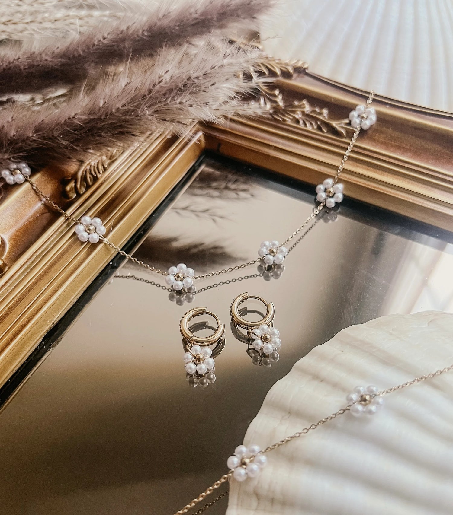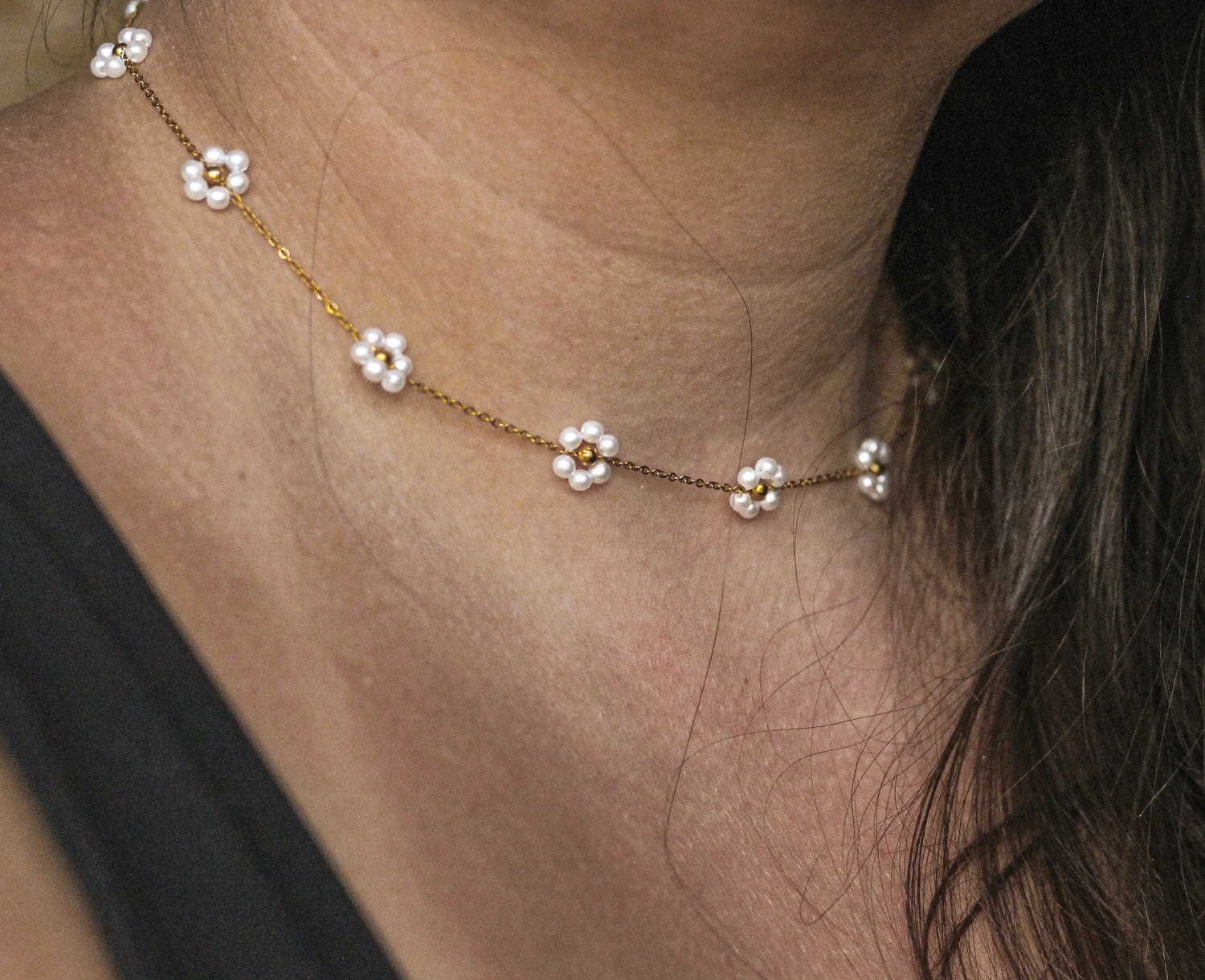 La chaîne Daisy est fabriquée en acier inoxydable plaqué 18k et de perles en acrylique.